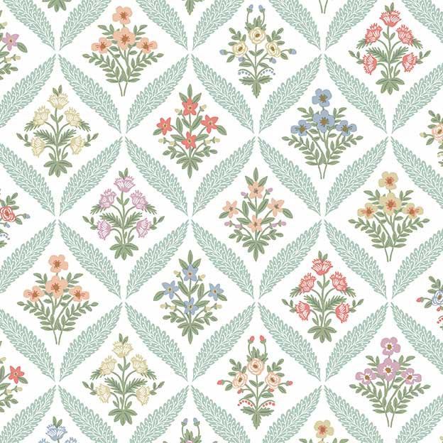 Lush and verdant, Willowberry features vines of greenery that are dotted with metallic berries. The colorways are all nature-inspired hues, ranging from a subtle neutral to soft greens to a deep blue.