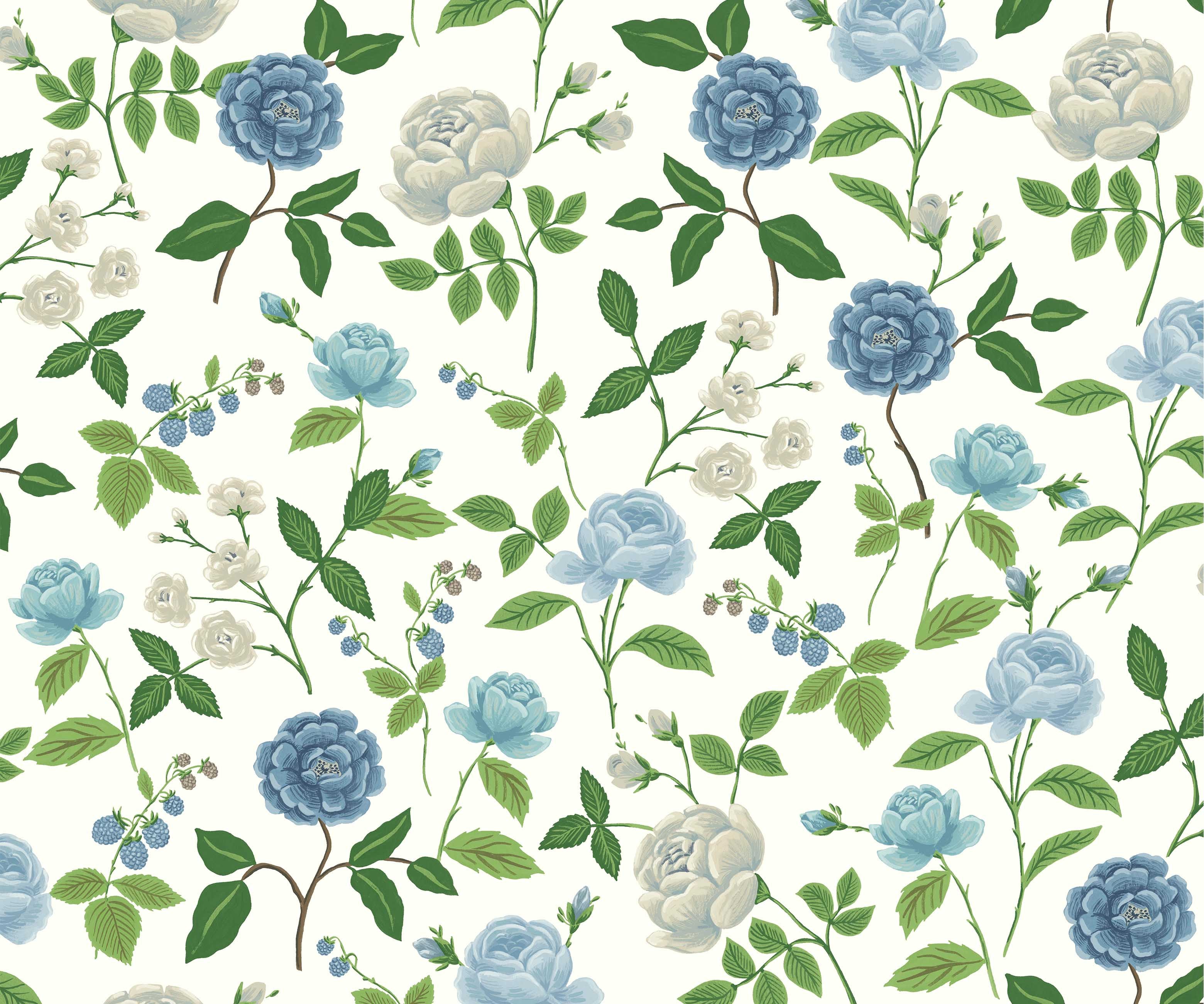 Lush and verdant, Willowberry features vines of greenery that are dotted with metallic berries. The colorways are all nature-inspired hues, ranging from a subtle neutral to soft greens to a deep blue.